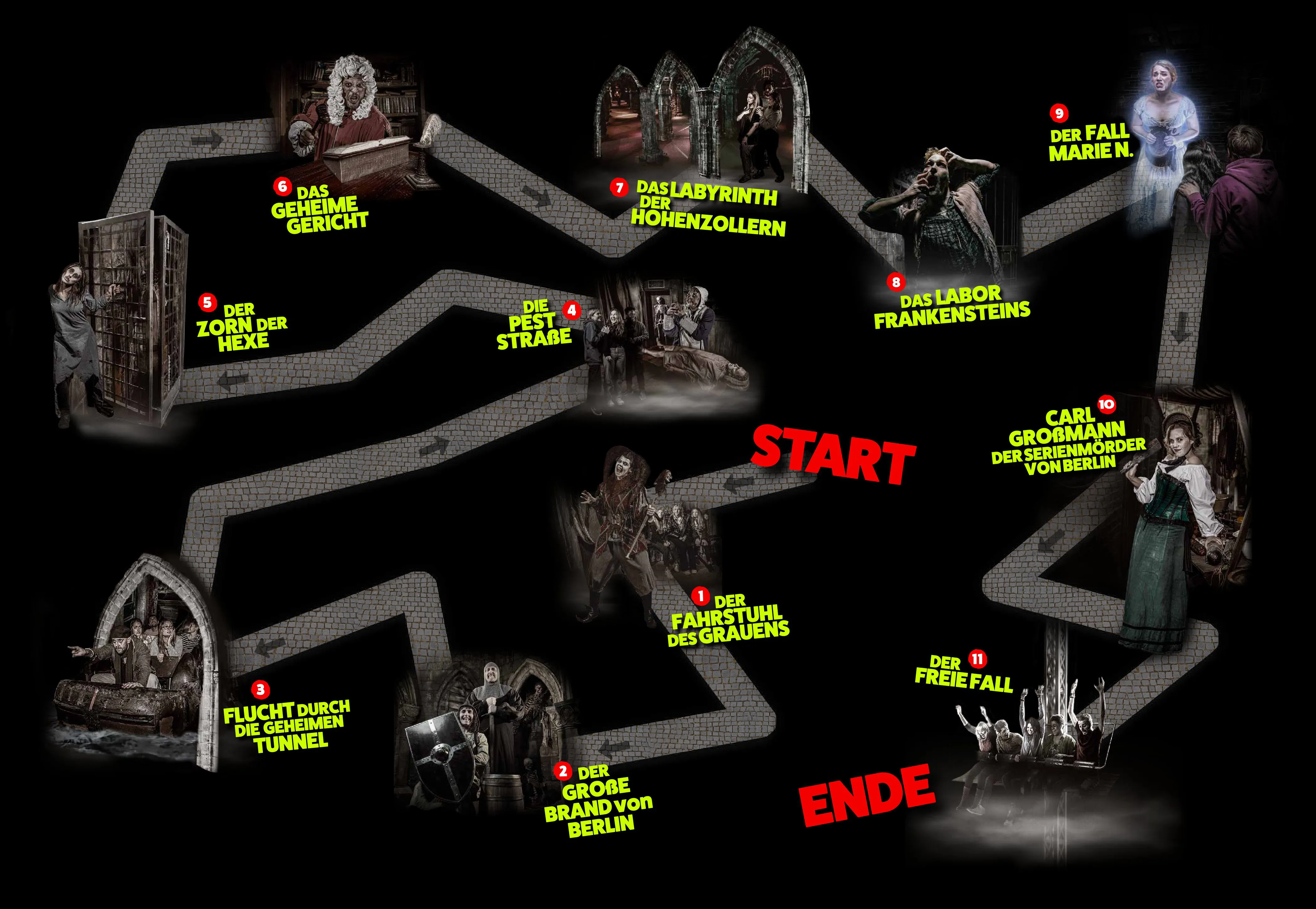 - 8 Liveshows und 2 Fahrgeschäfte mit professionellen Schauspieler:innen und überraschenden Spezialeffekten!