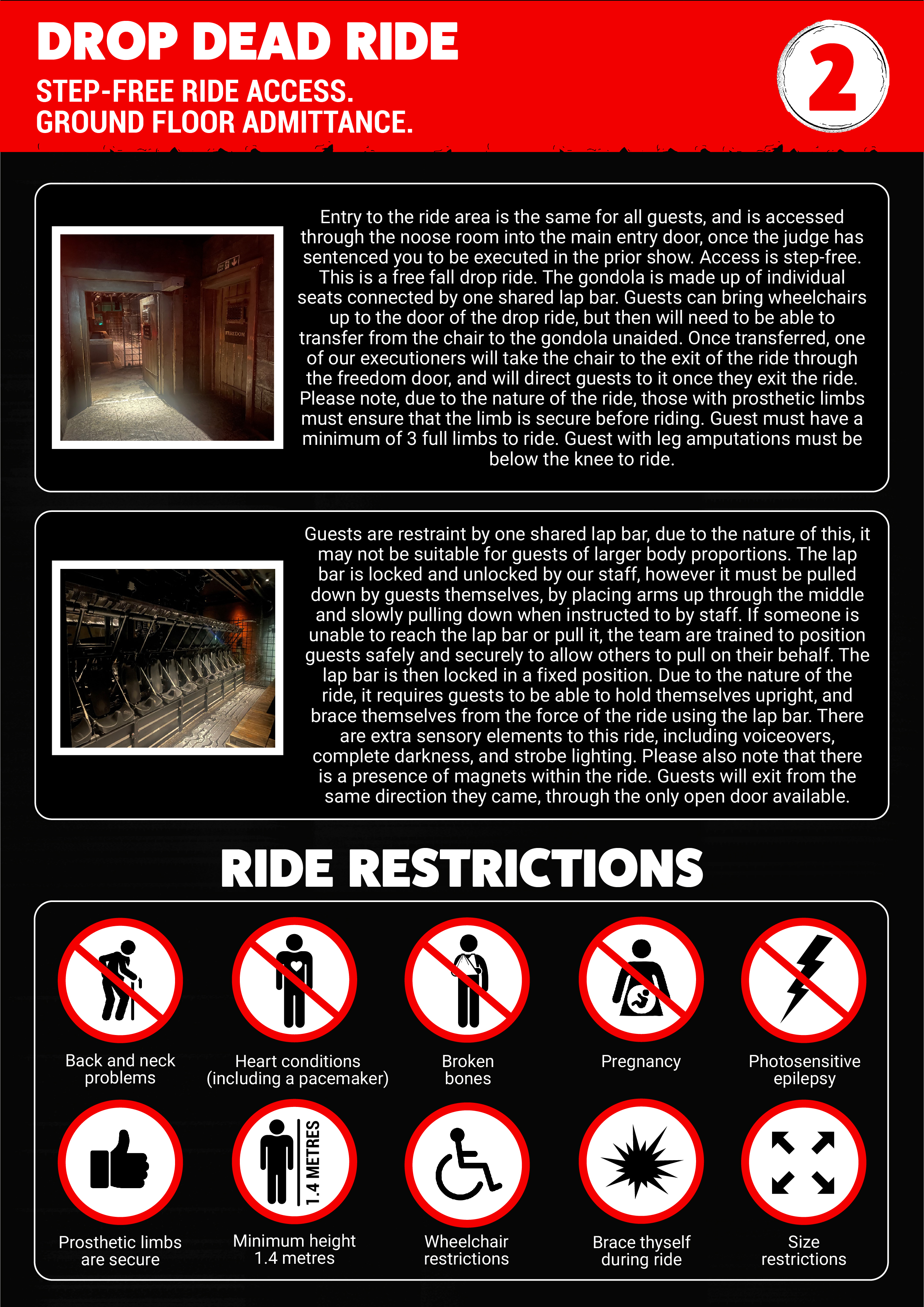 If any guests do not meet this health and safety criteria, for their own safety, they will unfortunately be unable to ride the Drop Dead Drop Ride. However, an alternative bypass route around the ride is available
